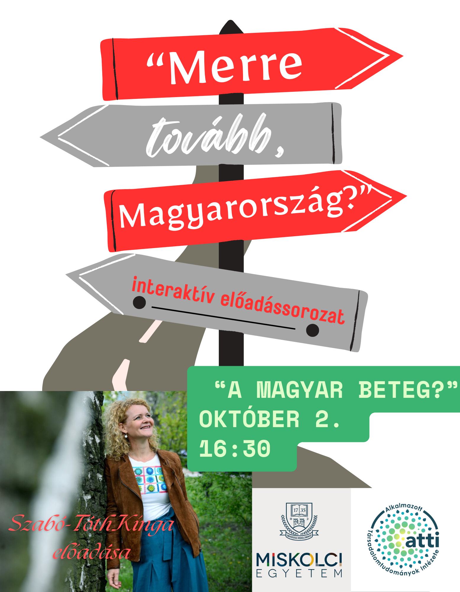 október 2. 16.30-18.00 a Miskolci Akadémiai Bizottság Székháza (Erzsébet tér 3.)"A magyar beteg?" Mentális jóllét közösségi és egyéni szinten – Szabó-Tóth Kinga (30 perc)